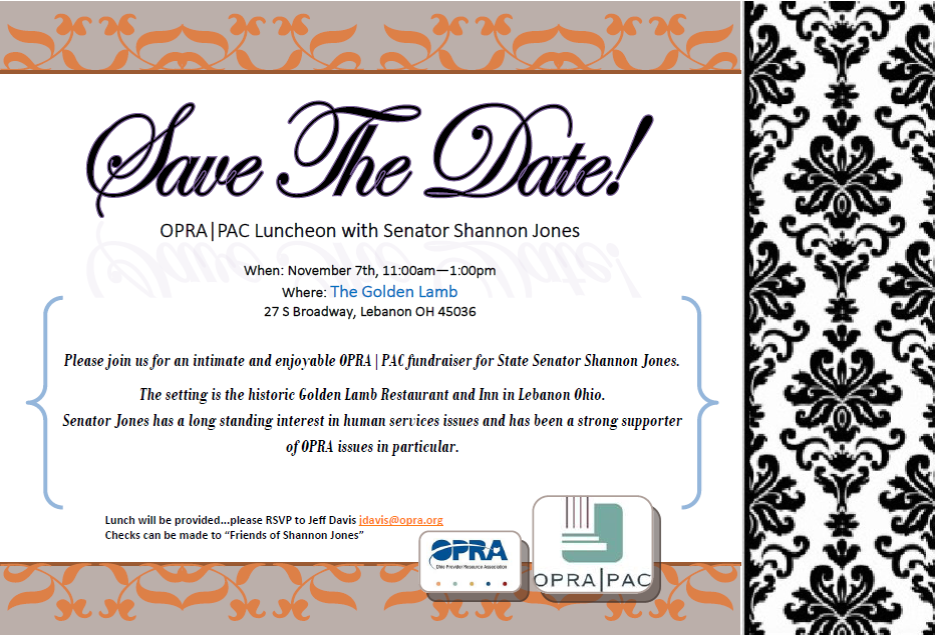 Jeff Great move to do this for Sen. Jones. I have to decline attending. My Grandson made 1st team All-conference for Urbana high school soccer as a freshman and that is his Sports Banquet dinner night. Please offer my thank you to the Senator. Than > On Oct 24, 2013, at 10:12 AM, "Jeff Davis" <JDavis@opra.org> wrote: > > Hello all: > > Please see information below on an upcoming exclusive OPRA PAC Luncheon with State Senator Shannon Jones. As you know we have had success in the past with putting together small, informal OPRA fundraisers for specific legislators that have been well received by both the individual legislators and members that have attended. We have another event scheduled with Shannon Jones on November 7th at the Golden Lamb in Lebanon. The nice and unique aspect of this upcoming event is that Senator Jones prefers a more intimate atmosphere with time dedicated to substantive discussions on issues of importance to us. We hope you can attend if your schedule permits. Please let me know so we have a good count of attendees. > > Jeff > > [cid:image001.png@01CECF48.D604D940] > > Leslie Minnich<mailto:lminnich@opra.org> > Executive Assistant > Ohio Provider Resource Association (OPRA)<http://www.opra.org/> > 1152 Goodale Blvd > Columbus OH 43212 > 614.224.6772 > > > This e-mail message, including any attachments, is for the sole use of the intended recipient(s) and may contain private, confidential and/or privileged information, such as HIPAA Protected Health Information. If you are not the intended recipient, be advised that any unauthorized use, disclosure, copying, distribution or the taking of any action in reliance on the contents of this information is strictly prohibited. If you have received this email in error, please immediately notify the sender via telephone at 614-224-6772 or by return e-mail. Thank you. > > Este mensaje de correo electrónico, incluidos los archivos adjuntos, es para uso exclusivo del destinatario (s) y puede contener información privada, confidencial y / o privilegiados, tales como HIPAA información de salud protegida. Si no es el destinatario, tenga en cuenta que cualquier uso no autorizado, revelación, copia, distribución o la toma de cualquier acción basada en el contenido de esta información está estrictamente prohibida. Si usted ha recibido este mensaje por error, por favor notifique inmediatamente al remitente por teléfono al 614-224-6772 o por correo electrónico de respuesta. Gracias. > You are receiving this important information as a member service of the Ohio Provider Resource Association. Unless messages and/or replies are specifically directed, each posting/response is sent to the entire group. This group is open only to members of the OPRA Board of Directors. The views of individual list serve users do not necessarily reflect the view of the entire OPRA Board or of the OPRA Staff. To send a message to this list serve, please use the reply button. To reply only to the original sender, please respond to the email listed after "on behalf of" in the FROM line of the message header. Thank you. > <image001.png> > <PAC_SaveTheDate_Jones_11.7.13.png> ________________________________ Confidentiality Notice: This e-mail message, including any attachments, is for the sole use of the intended recipient(s) and may contain confidential and privileged information. Any unauthorized review, use, disclosure or distribution is prohibited. If you are not the intended recipient, please contact the sender by reply e-mail and destroy all copies of the original message.